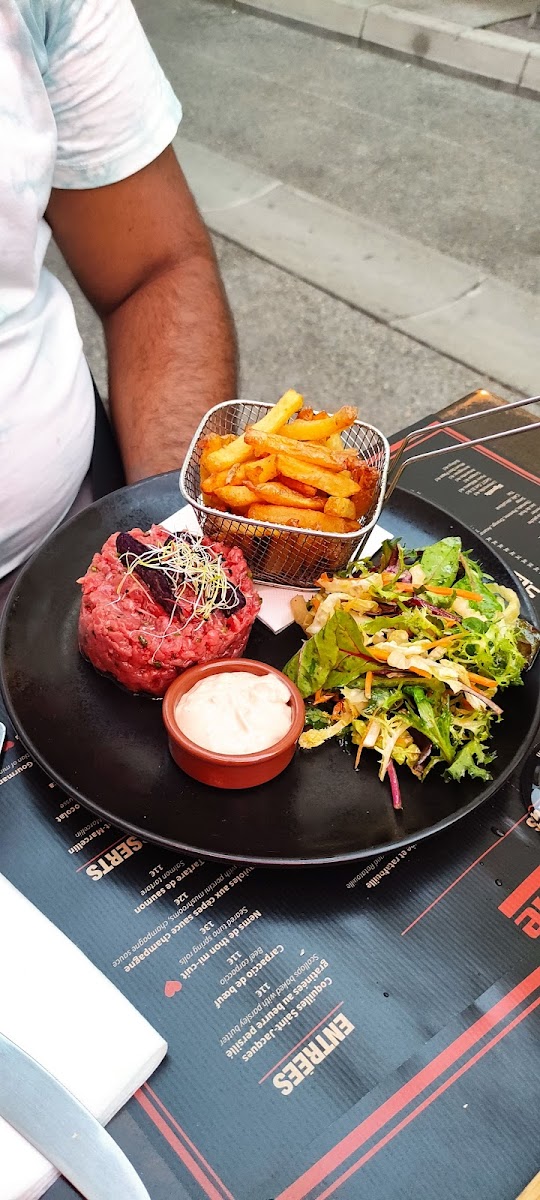 Nice restaurant. We had dinner with three. Took a maincourse and desert. I had the raw meat. Sauce was good. Afterwards pain perdu. Good too. Red wine was great too. The staff very quick. We had a table inside. The airco made it pleasant. We sat at a long table with other people, but seperated by plexiglass.